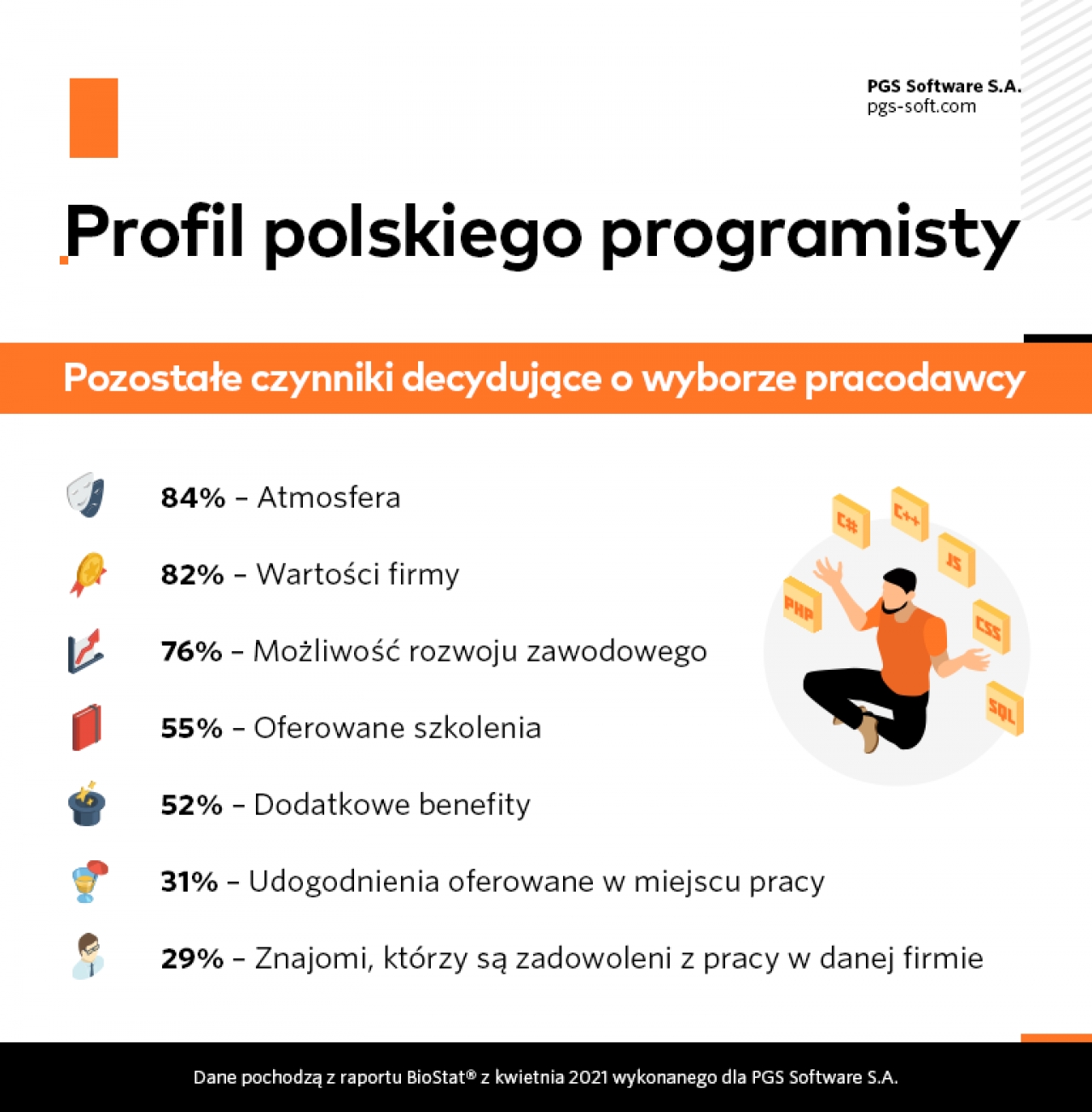 Dobre zarobki – to wiemy wszyscy. Ale pieniądze to nie wszystko, zwłaszcza na tak chłonnym rynku jak IT. Odpowiedzi na to, co jeszcze wpływa na decyzje zawodowe polskich programistów oraz jaką drogę przeszli od początku swoich karier przynosi nam najnowsze badanie Biostat zrealizowane na zlecenie PGS Software SA.