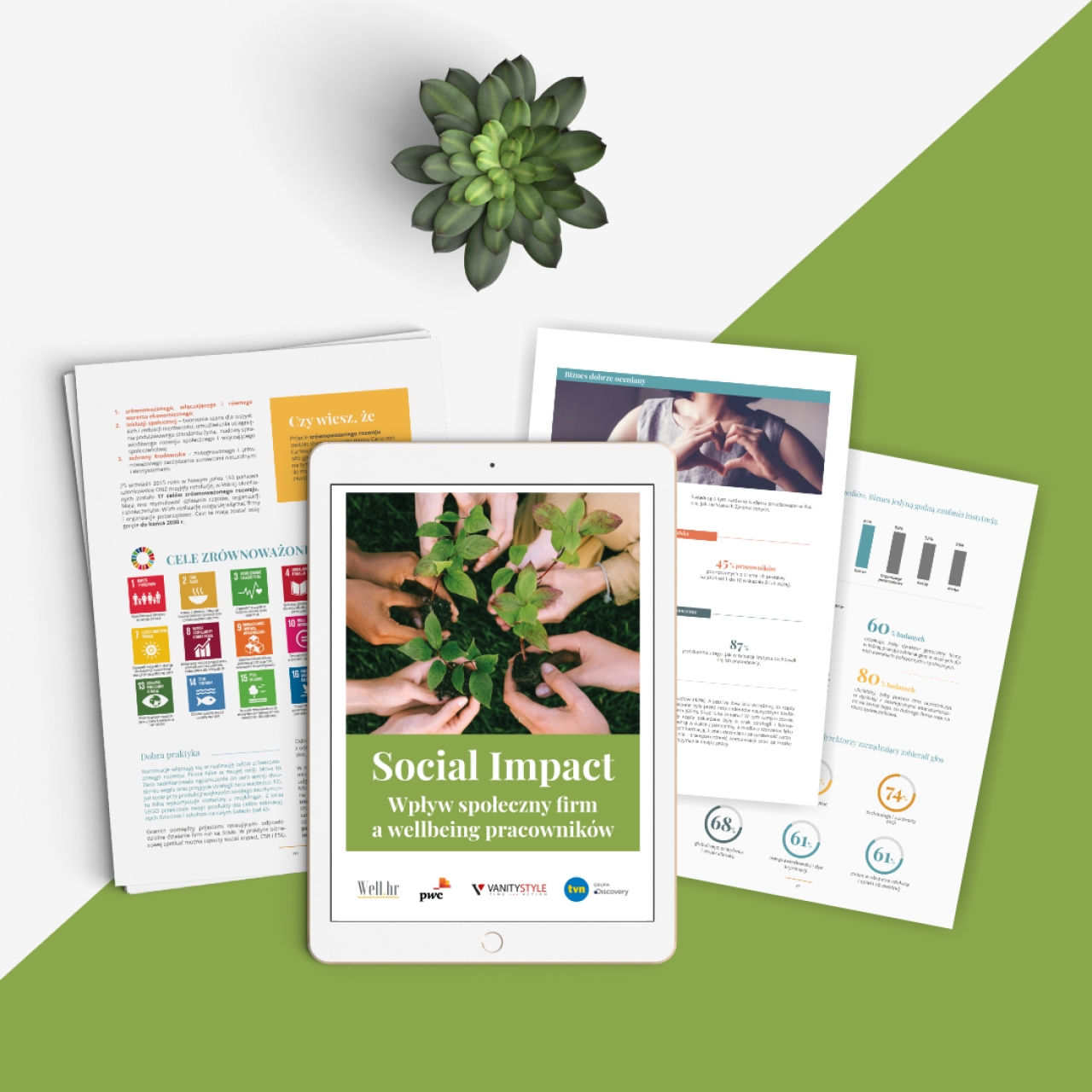 Raport pt. „Social impact. Wpływ społeczny firm a wellbeing pracowników” to kompleksowy przewodnik po tematyce wpływu społecznego. Zawiera on  informacje o trendach, które sprawiły, że social impact jest dziś tak ważny, przedstawia dowody na to, że odpowiedzialne działania firm przekładają się na wellbeing pracowników. Autorzy raportu dzielą się wynikami badań i setkami dobrych praktyk. Podpowiadają, jak budować zaangażowanie pracowników w wolontariat i podają przykłady firm, które postępują odpowiedzialnie wobec planety, społeczności i pracowników. Partnerami raportu są firmy PwC. TVN Discovery i VanityStyle, a jej sponsorem Fundacja ORLEN. Raport jest dostępny w dwóch wersjach językowych – polskiej i angielskiej - na stronie:  https://wellbeingposwojemu.pl/social-impact.