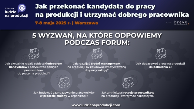Dyrektorzy i managerowie produkcji podzielą się swoimi doświadczeniami w zakresie skutecznego zarządzania zespołami produkcyjnymi podczas forum LUDZIE NA PRODUKCJI organizowanego 7-8 maja 2025 w Warszawie. Wśród pierwszych potwierdzonych prelegentów są Dyrektorzy oraz Managerowie produkcji czołowych firm produkcyjnych w Polsce. Organizatorem wydarzenia jest brave conferences – firma konferencyjna realizująca od 6 lat konferencje biznesowe na rynku polskim.