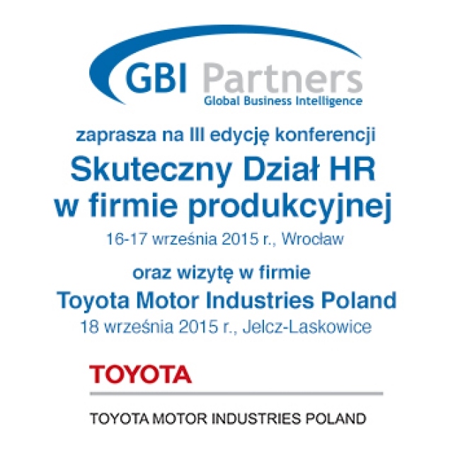 Zapraszamy Państwa na III edycję konferencji pod hasłem: SKUTECZNY DZIAŁ HR W FIRMIE PRODUKCYJNEJ, która odbędzie się w dniach 16-17 września 2015 r. oraz na wizytę towarzyszącą konferencji w ZAKŁADZIE TOYOTA MOTOR INDUSTRIES POLAND zaplanowaną na 18 września 2015 r.
