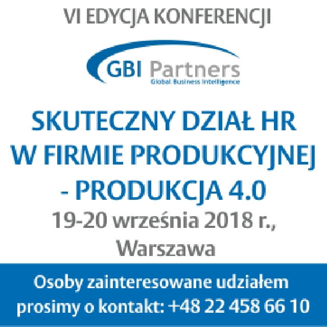 W dniach 19-20 września 2018 r. w Warszawie odbędzie się VI edycja konferencji: „SKUTECZNY DZIAŁ HR W FIRMIE PRODUKCYJNEJ – PRACOWNIK 4.0, na której gościć będzie kadra zarządzającą działami personalnymi firm produkcyjnych z dużych i średnich firm.