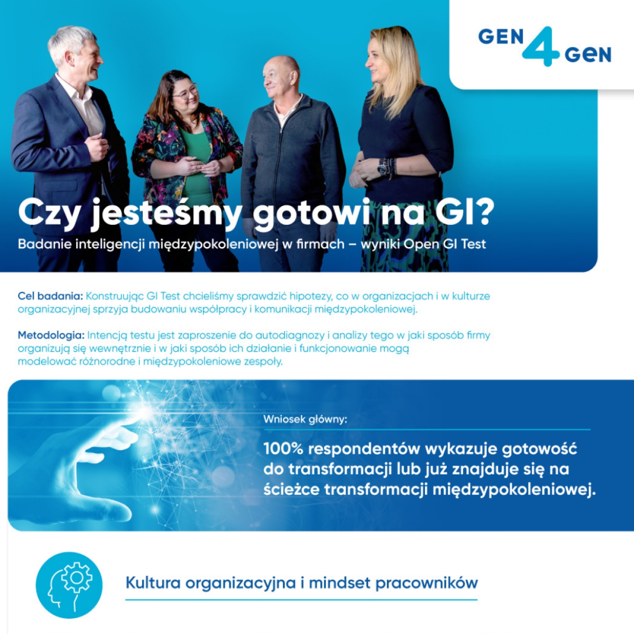 Badanie Open GI Test przeprowadzone wśród koalicjantów w ramach projektu Gen4Gen przez mentorkę Joannę Andryszczak-Lewandowską jednoznacznie wskazuje, że respondenci GI Test podjęli kroki w kierunku transformacji międzypokoleniowej, ale jednocześnie brak jest im precyzyjnych informacji, co do tego w jaki sposób firma realizuje zamysł międzypokoleniowości lub na tą chwilę ten aspekt nie jest w organizacji kluczowy. Wyniki badania dały również inne cenne wnioski dotyczące współpracy i komunikacji międzypokoleniowej w środowisku biznesowym. Zbadano m.in. co w organizacjach oraz w ich kulturze sprzyja budowaniu międzypokoleniowych mostów.