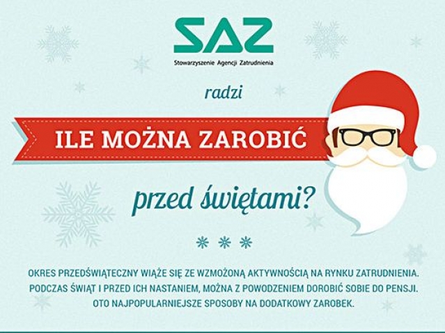 Jedną z popularniejszych propozycji zatrudnienia we wspomnianym okresie jest praca w stroju Mikołaja. Za wizytę w domu czy biurze taki pracownik może zarobić 150-300 zł/godz. Stacjonarna praca w stroju Mikołaja, przykładowo na stoisku sprzedażowym, jest wynagradzana stawką 15-30 zł/godz. Wśród innych popularnych „świątecznych zawodów” należy wymienić sprzedawców karpi z zarobkiem na poziomie 18-25 zł/godz, sprzedawców choinek - 10-15 zł/godz, hostessy - 15-25 zł/godz, osoby do pakowania prezentów - 10-18 zł/godz, osoby do rozkładania towarów - 16-18 zł/godz. Pracodawcy szukają również pomocy przy inwentaryzacji, sprzątaniu domów oraz usługach kurierskich.