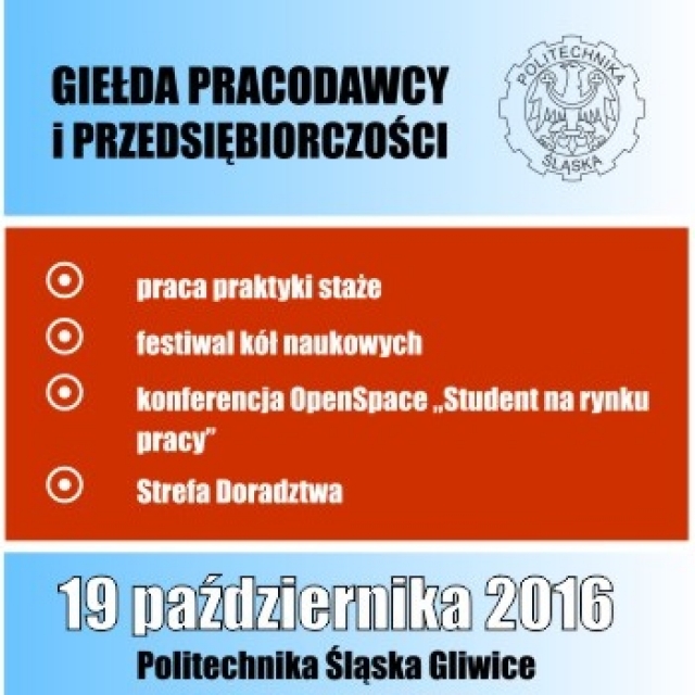 Politechnika Śląska już po raz X organizuje Giełdę Pracy i Przedsiębiorczości. Tegoroczna edycja odbędzie się 19 października 2016, w godz. 9.00-15.00, w Centrum Edukacyjno-Kongresowym Politechniki Śląskiej w Gliwicach przy ul. Konarskiego 18B.