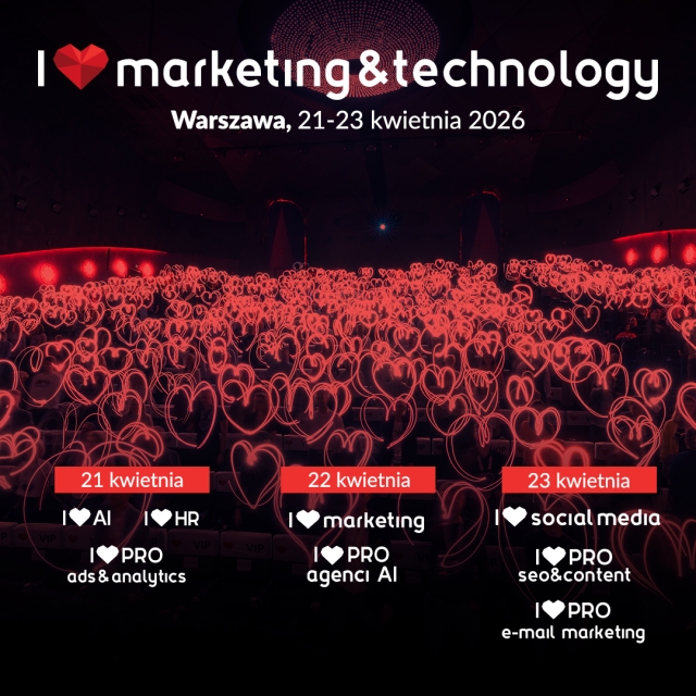 21-23 kwietnia 2026 roku w Multikinie Złote Tarasy w Warszawie odbędzie się kolejna edycja konferencji I ❤️ Marketing & Technology - eventu, który od lat gromadzi marketerów, menedżerów, przedsiębiorców oraz specjalistów branży marketingu, technologii czy HR.