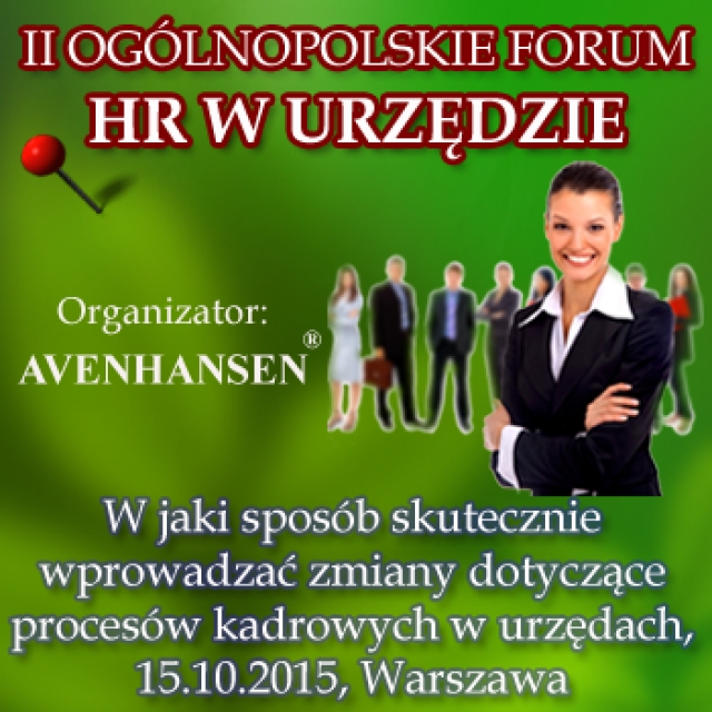 Zapraszamy 5 października 2015 r., godz. 10:00 -15:45 na II Ogólnopolskie Forum- HR w Urzędzie, miejsce Golden Floor Plaza, Aleje Jerozolimskie 123A. Do udziału zapraszamy Kierowników i Pracowników komórek kadrowych oraz Dyrektorów, Naczelników, Kierowników Zespołów Urzędów Administracji Publicznej.