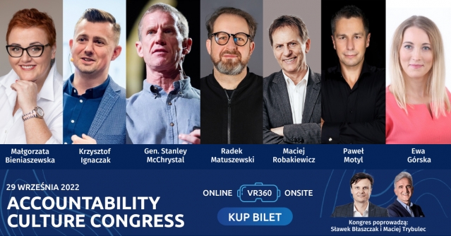 Na scenie kongresu nie zabraknie wybitnych mówców i praktyków kultury accountability z Polski i ze świata - wystąpią m.in. gen. Stanley McChrystal (autor koncepcji Team of Teams), Pawel Motyl, Małgorzata Bieniaszewska, Sławek Błaszczak, Radek Matuszewski, Maciej Robakiewicz, Maciej Trybulec, Ewa Górska, Paweł Klepacki, Robert Gaweł, Krzysztof „Igła” Ignaczak.
