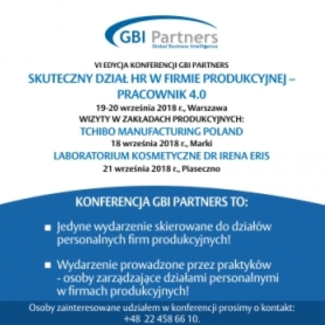 W dniach 19-20 września 2018 r. w Warszawie odbędzie się VI edycja konferencji: „SKUTECZNY DZIAŁ HR W FIRMIE PRODUKCYJNEJ – PRACOWNIK 4.0, na której gościć będzie kadra zarządzającą działami personalnymi firm produkcyjnych z dużych i średnich firm.