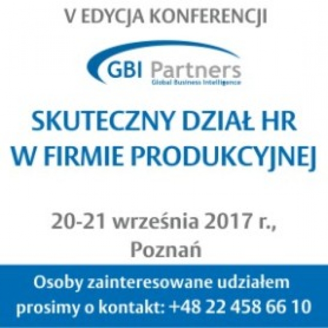 W imieniu zespołu GBI Partners serdecznie zapraszamy Państwa na V edycję konferencji pod hasłem: SKUTECZNY DZIAŁ HR W FIRMIE PRODUKCYJNEJ, która odbędzie się w dniach 20-21 września 2017 r. oraz na wizytę towarzyszącą konferencji w zakładzie Beiersdorf Manufacturing Poznań zaplanowaną na 22 września 2017 r. To wyjątkowe wydarzenie dla praktyków zarządzania obszarem HR w firmach produkcyjnych, poprzednie edycje wydarzenia były bardzo wysoko ocenione przez uczestników, zapraszamy. Liczba miejsc jest ograniczona, decyduje kolejność zgłoszeń.