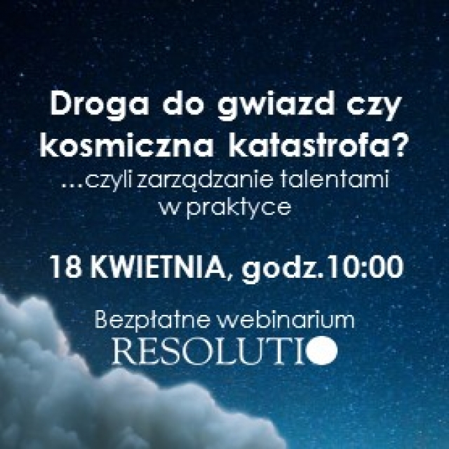 Droga do gwiazd czy kosmiczna katastrofa? ...czyli o zarządzaniu talentami w praktyce. W środę, 18 kwietnia o godz. 10.00 odbyło się bezpłatne webinarium RESOLUTIO. Czas trwania: 60 minut. Na webinarium RESOLUTIO, zostały poruszone najważniejsze wątki zarządzania talentami w organizacjach. Można byo zapoznać się z najciekawszymi case’y, wynikami badań oraz znaleźć odpowiedzi na wiele pytań.