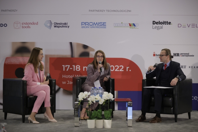 Następny panel dotyczył nowych aspektów pozafinansowej motywacji pracowników. Prowadzący Mirosław Kachniewski (Prezes Zarządu, Stowarzyszenie Emitentów Giełdowych) w rozmowie z Aleksandrą Rudnicką (Coach i Trener, Wellbee) rozważali czy zdrowie psychiczne pracownika to benefit czy nowy standard? Jakie korzyści dla pracowników a jakie dla firm płyną z pozafinansowej motywacji pracownika? Jakie są wady motywacji finansowej?