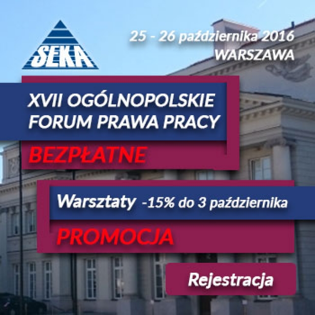 W dniach 25- 26 października SEKA S.A. organizuje już XVII edycję Ogólnopolskiego Forum Prawa Pracy. Wzorem lat ubiegłych miejscem wydarzenia będzie Pałac Prymasowski w Warszawie. I tym razem wybrano dla Państwa dwa wiodące i ważne dla pracodawców tematy.