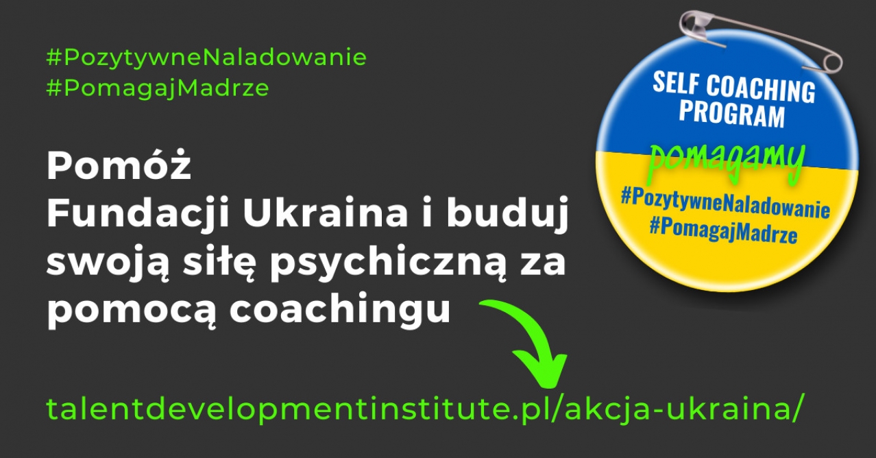 Od 14 marca przez miesiąc Talent Development Institute udostępnia swój flagowy program Self Coaching Program, w którym każdego dnia będą prowadzone sesje coachingowe i szkoleniowe w celu wzmocnienia swojej siły psychicznej. Aby dołączyć do akcji wystarczy wpłacić cegiełkę w wysokości minimum 50 zł na rzecz Fundacji Ukraina i przesłać potwierdzenie wpłaty na adres kontakt@talentdevelopmentinstitute.pl Wówczas zostanie wysłany dostęp do Programu i harmonogramu wszystkich sesji.