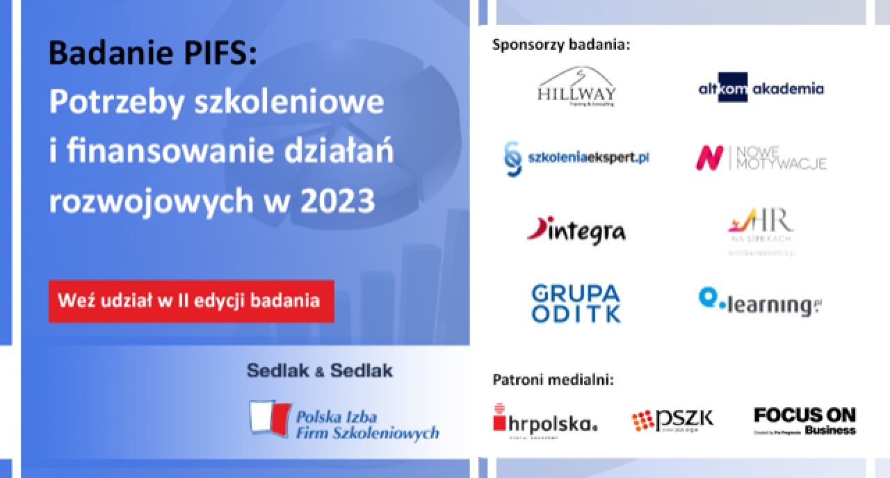 W czasach permanentnych zmian niezwykle ważnym jest podejmowanie świadomych decyzji strategicznych w oparciu o fakty i wyniki rzetelnych badań. Stąd też Polska Izba Firm Szkoleniowych jako profesjonalna organizacja wspierająca rozwój po raz drugi organizuje badanie diagnozujące oczekiwania rynku pracy w zakresie szkoleń i działań rozwojowych, a uczestnicy badania, którzy pozostawią swoje dane otrzymają od PIFS Raport z badania bezpłatnie.