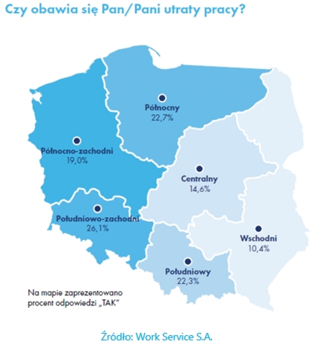 W województwach lubelskim, podkarpackim, świętokrzyskim oraz podlaskim prawie 90% mieszkańców jest spokojnych o obecne miejsce pracy. Równie optymistycznie wyniki prezentują się w regionie Centralnym, obejmującym Mazowsze i Łódź, gdzie tylko 14,6% pracowników nie jest pewnych swojego zatrudnienia, podczas gdy ogólnopolski odsetek wynosi 18,6%. Dodatkowo, mieszkańcy wschodniej Polski najrzadziej myślą o zmianie pracy – 15,4%, podczas gdy wśród wszystkich Polaków odsetek ten wynosi 22,2%.