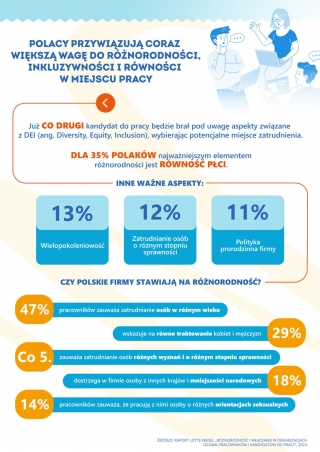 Wraz ze zmianami społecznymi w naszym kraju, z roku na rok rośnie znaczenie różnorodności w firmach. Już co drugi kandydat do pracy będzie analizował aspekty związane z DEI[1] (ang. Diversity, Equity, Inclusion), wybierając potencjalne miejsce zatrudnienia. Najważniejszym elementem różnorodności dla 35% Polaków jest równość płci – wynika z badania przeprowadzonego na zlecenie firmy Wedel. Niestety, nie wszystkie organizacje odpowiadają na tę potrzebę – co trzeci pracownik nie dostrzega w swoim miejscu pracy żadnego przejawu różnorodności, a 6 na 10 firm w ocenie pracowników nie jest przystosowana do zatrudniania osób z niepełnosprawnościami.